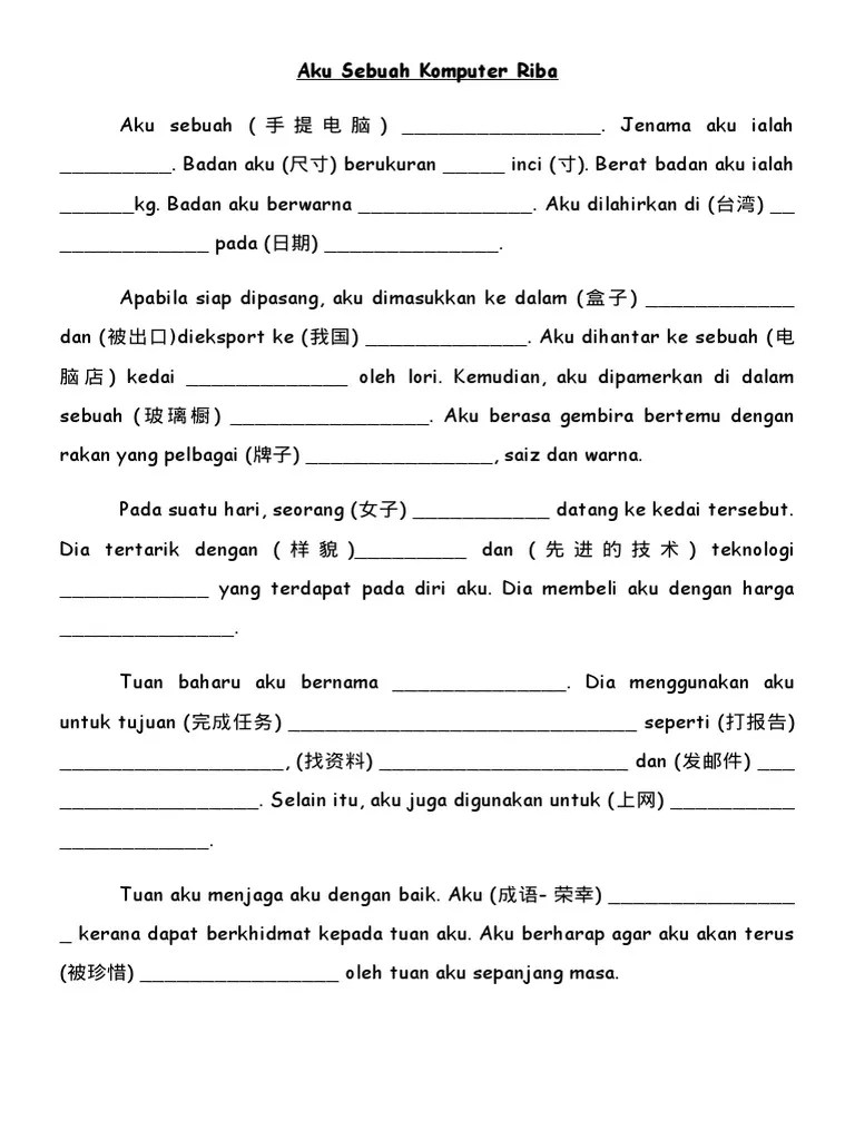 Unduh sebagai docx, pdf, txt atau baca online dari scribd. Karangan ini ditulis oleh murid 6d(2011):sia wei cong. Aku sebuah komputer riba dia hendak membeli sebuah komputer riba.